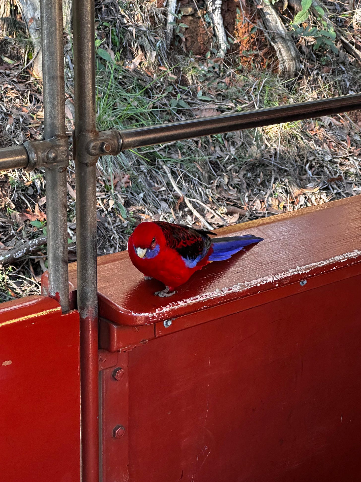A Rosella, though I don’t know its name yet, perched by the window, right there, close enough to touch.
